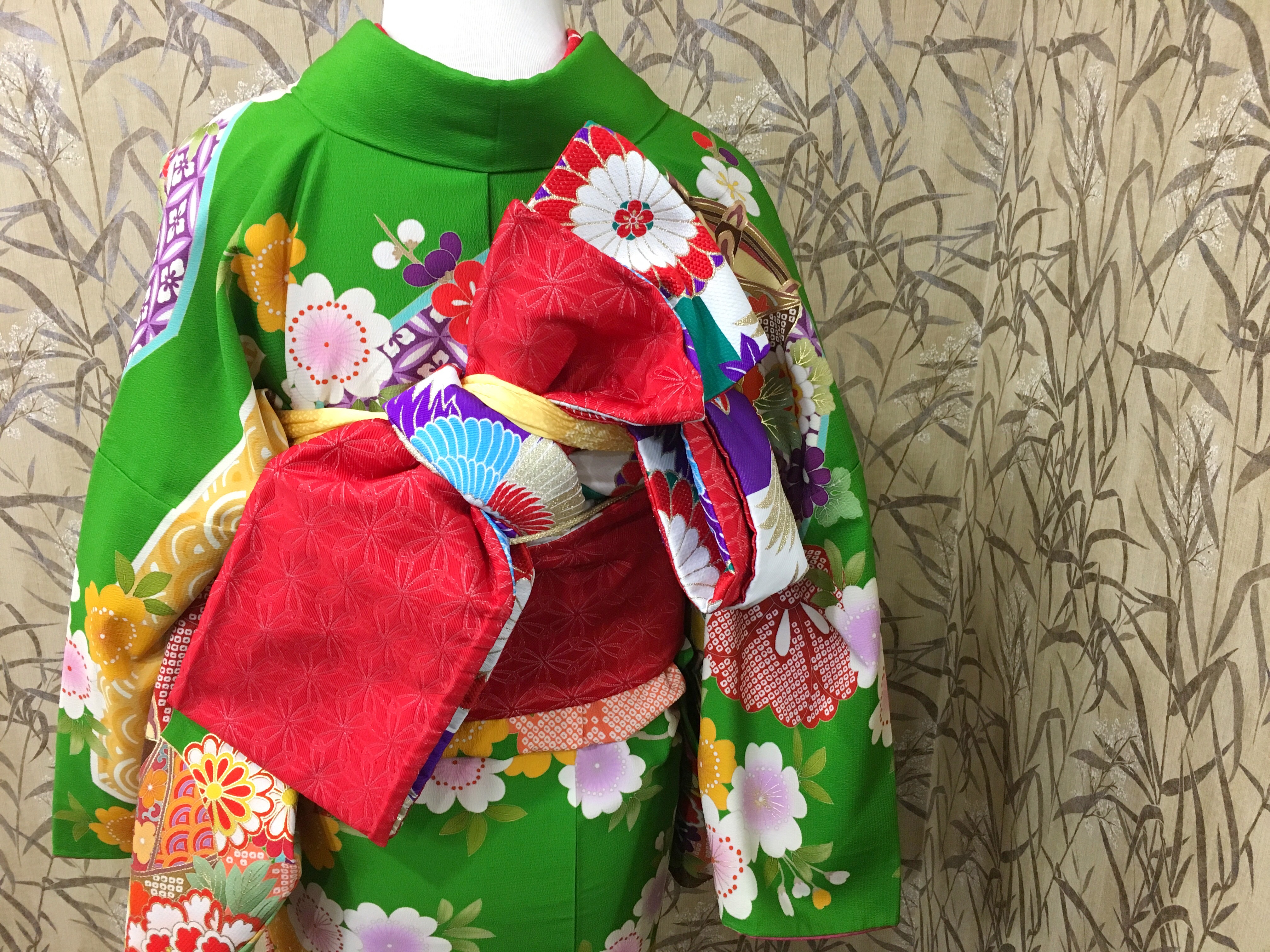 人目を引く華やかな緑のお着物です( ^ω^ )❤️✨
