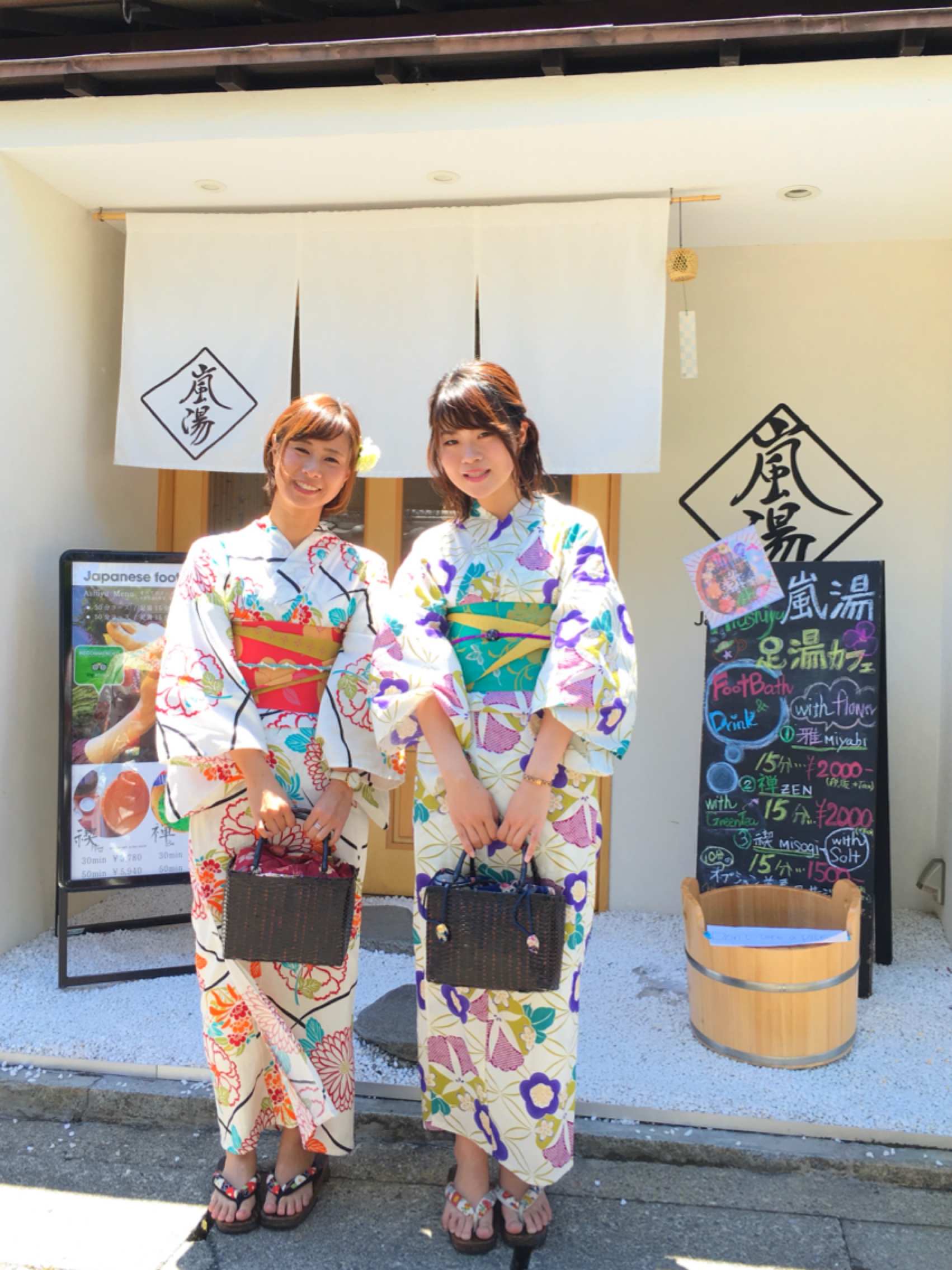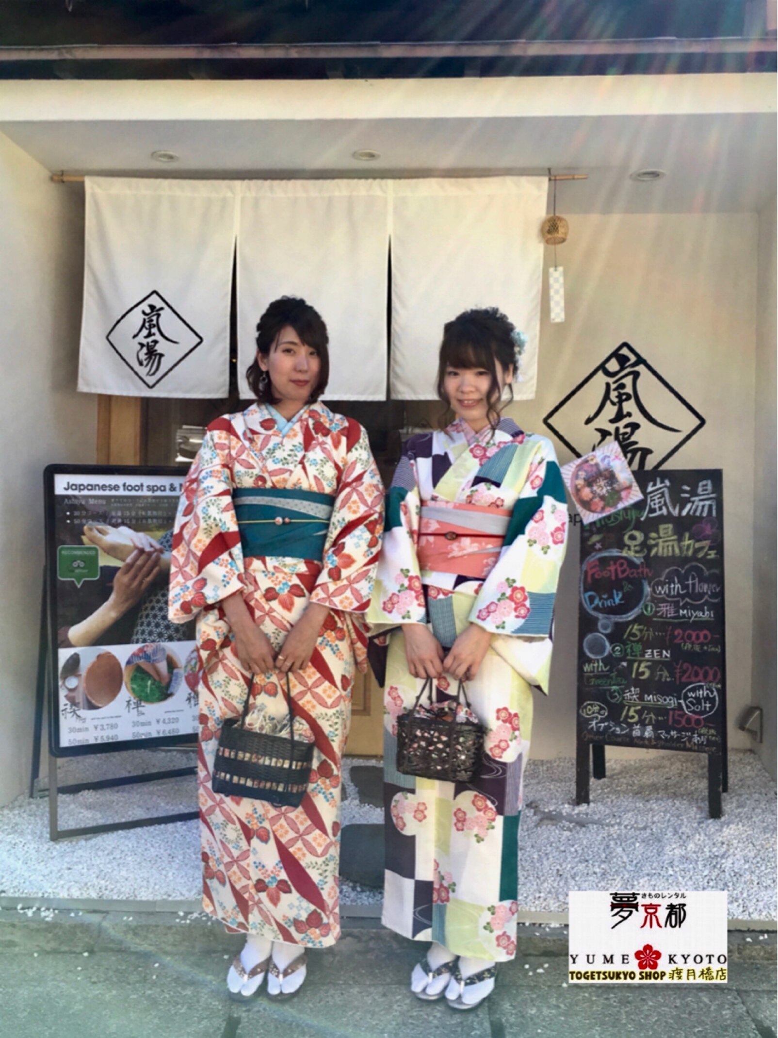 嵐山を着物レンタルで散策👘&フォトジェニックな四季の草花💐を浮かべた癒しの足湯とお飲み物がセットになった大人気のコラボメニューなんです❤️