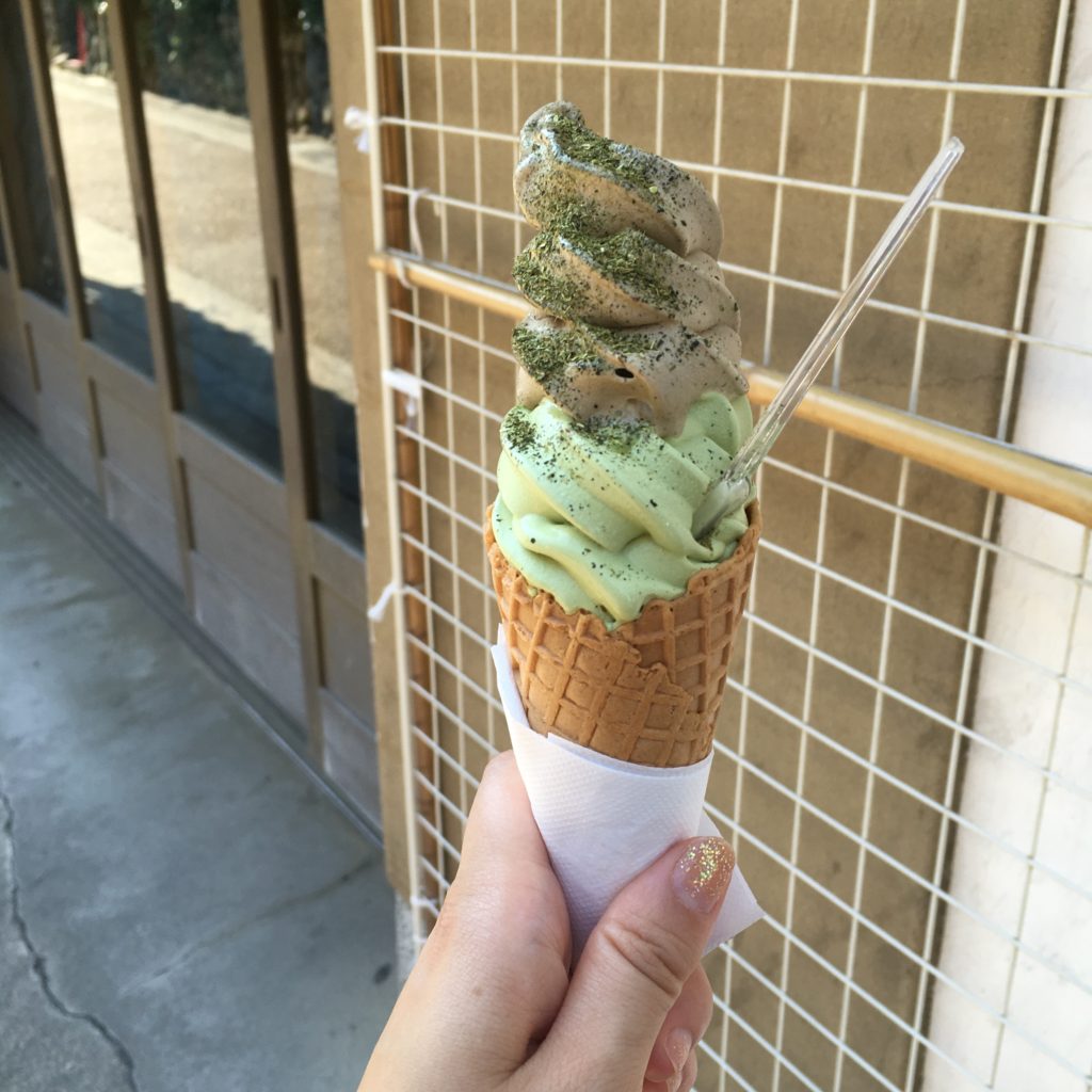抹茶とほうじ茶、粉末のお茶のよくばりソフトクリームは絶品です❤