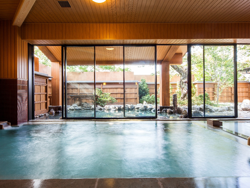 日帰り温泉施設「風風(ふふ)の湯」。庭園を望む露天風呂のほかに、シルキー湯やミストサウナなど、6種類のお風呂を用意。泉質は神経痛や筋肉痛などに効能がある弱アルカリ性の単純泉で、美肌効果も期待できます。