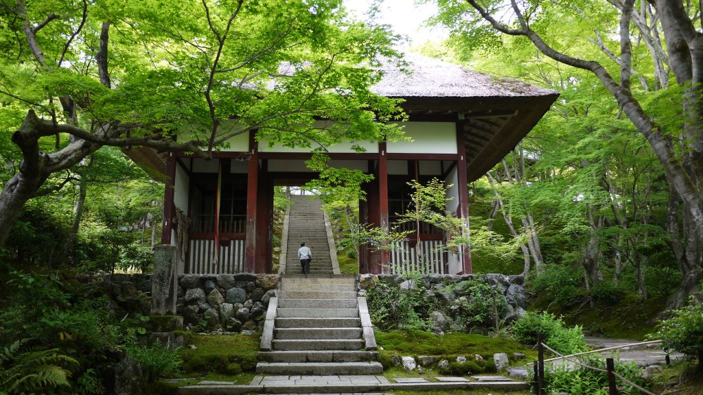 茅葺がめずらしい仁王門を抜けると急な石段があり、本堂まで続く石段は秋には紅葉で色鮮やかに染まり、新緑の季節は緑のトンネルで覆われます。また春過ぎから梅雨にかけての常寂光寺は新緑と苔の美しさが際立ちます🌿